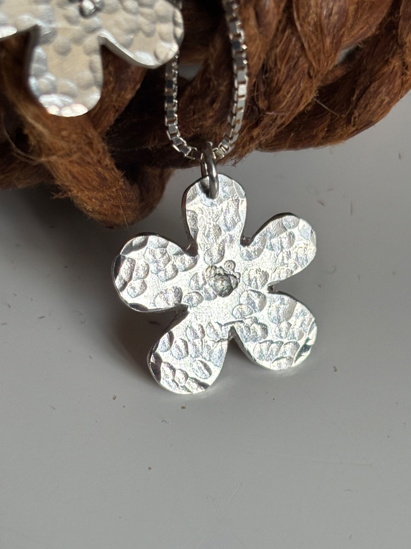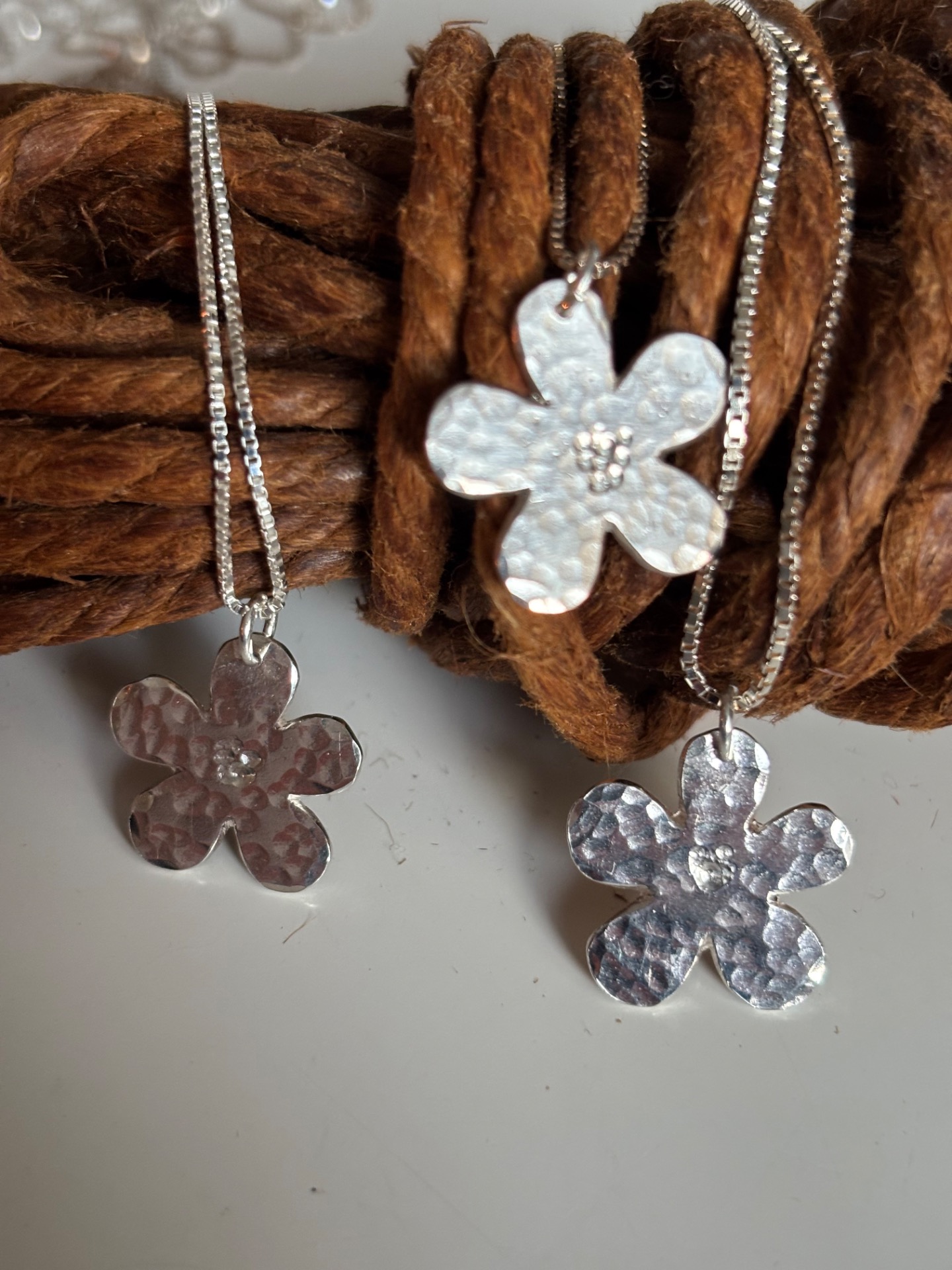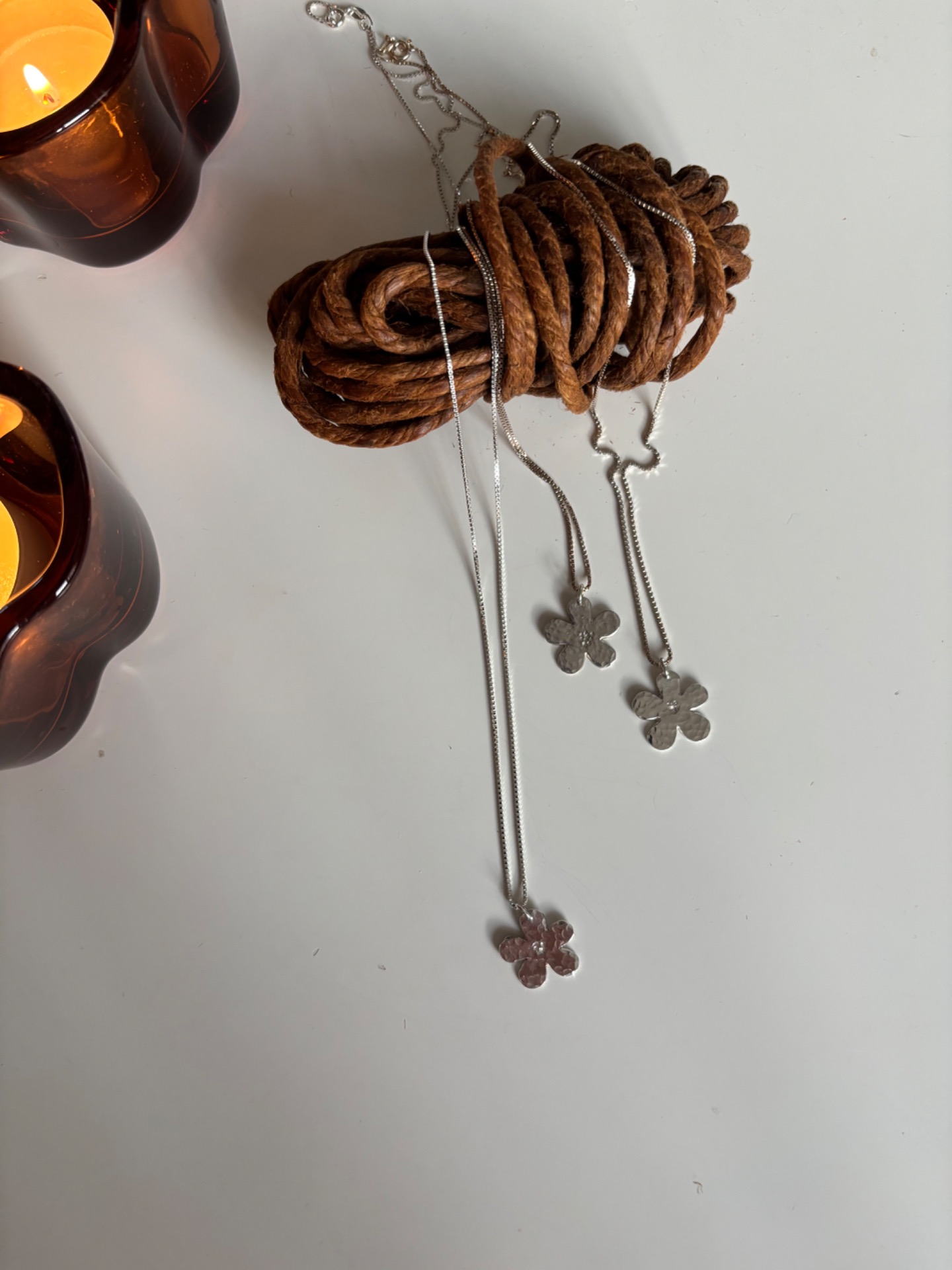 En handsågad blomma i 1mm tjock silverplåt. Mäter ca 1,5cm. Du väljer längd på kedjan och utförande.