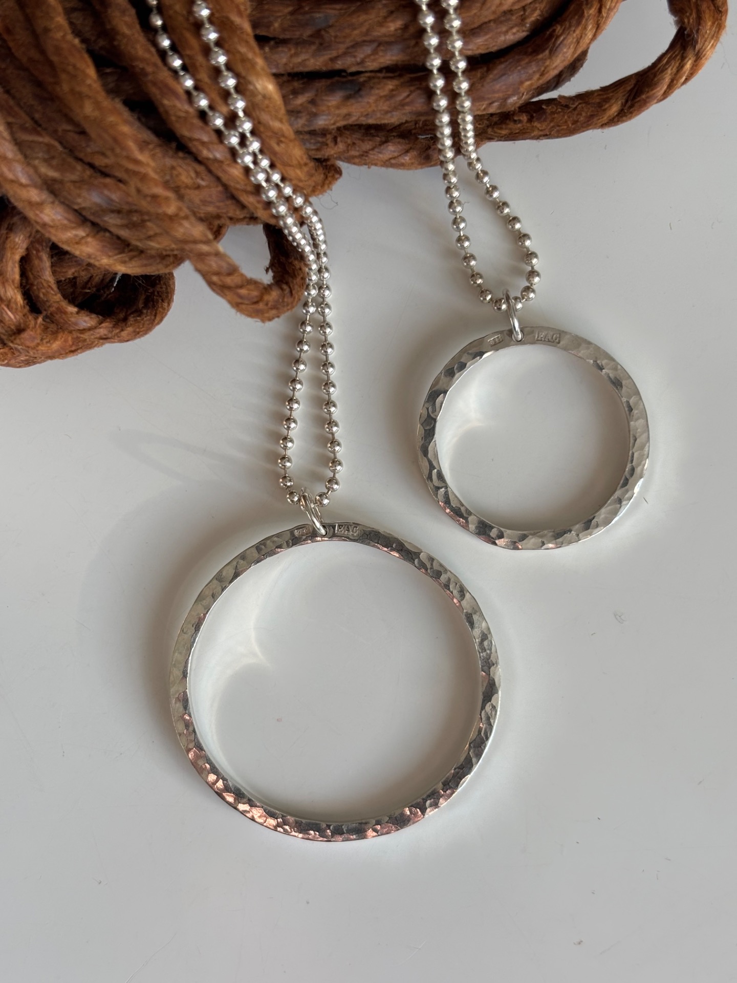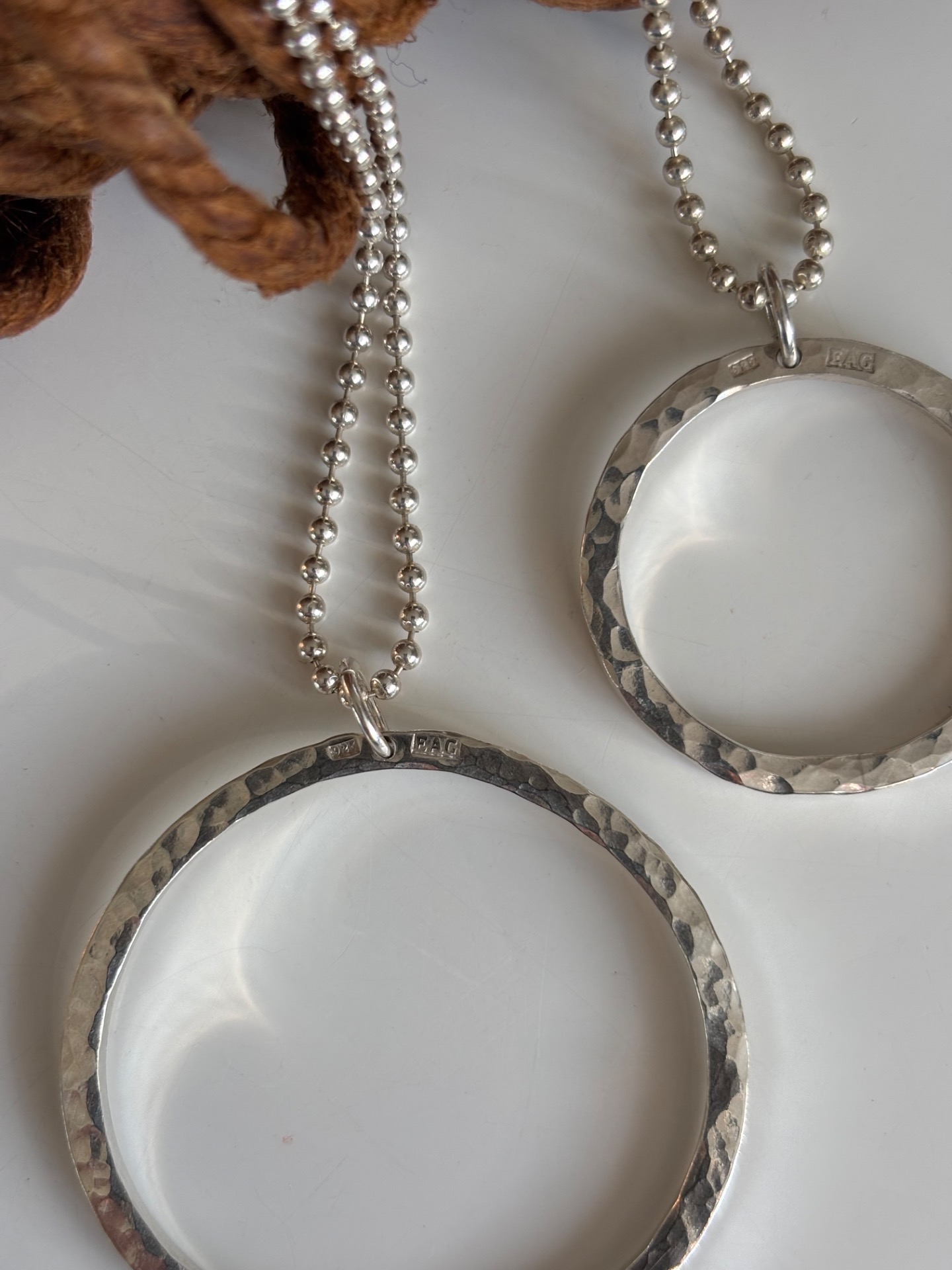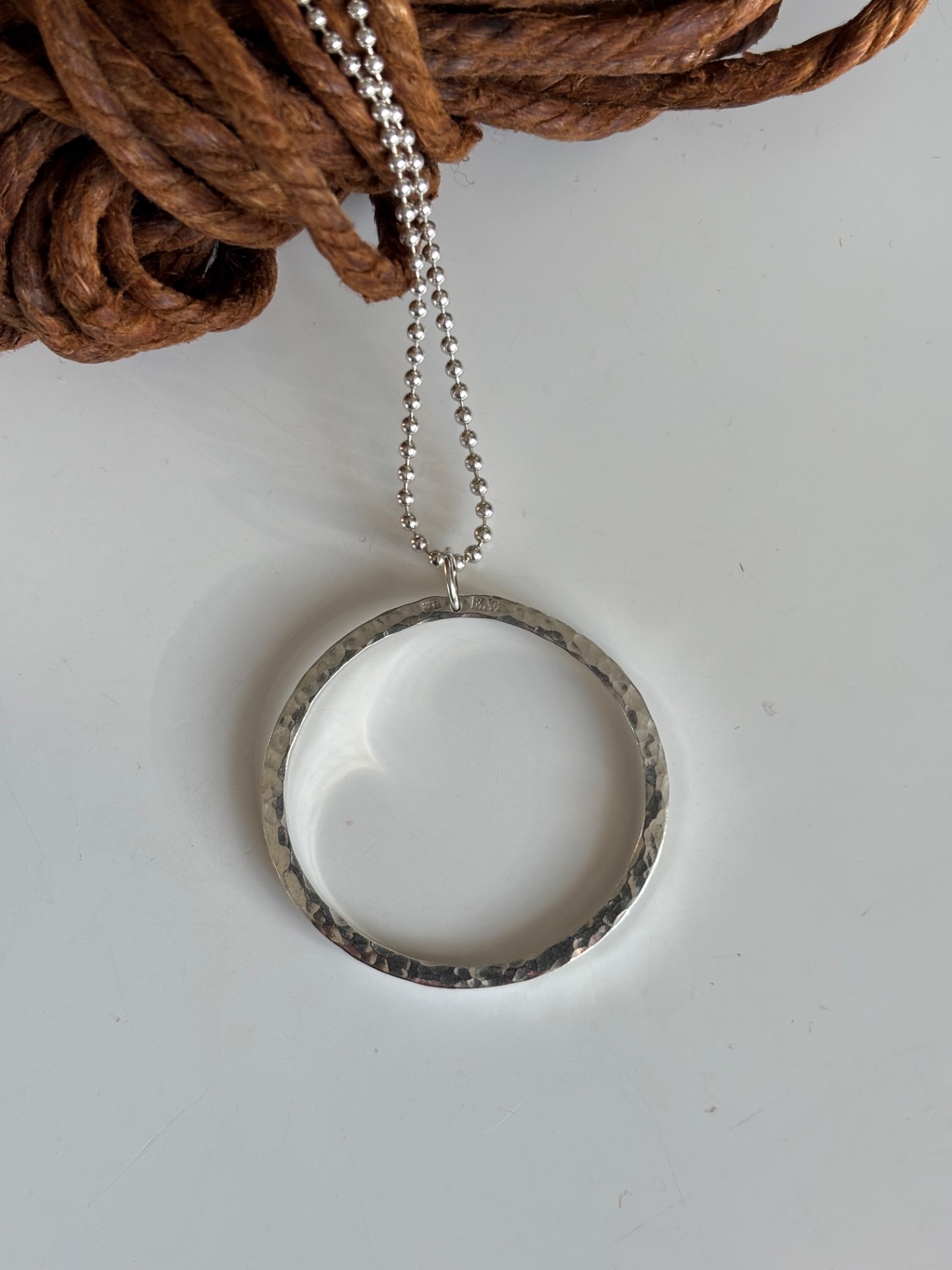 Lätt hamrat smycke av fyrkantig silvertråd. 2,5mm tjockt. Mäter 4,5cm rakt över. Välj längd på kedja.